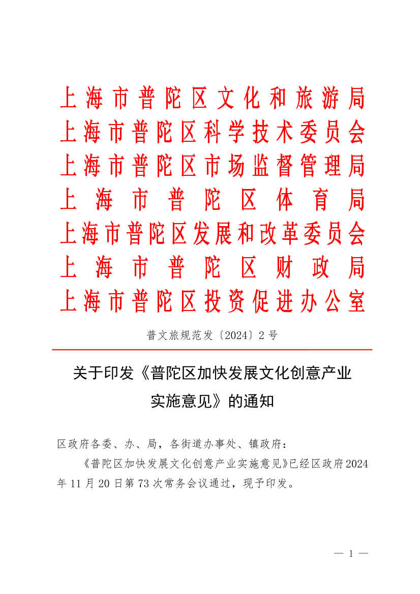《普陀区加快发展文化创意产业实施意见》已经区政府2024年11月20日第73次常务会议通过,现予印发。