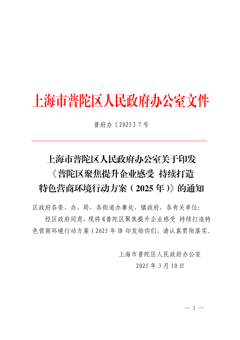 上海市普陀区人民政府办公室关于印发《普陀区聚焦提升企业感受 持续打造特色营商环境行动方案(2025年)》的通知