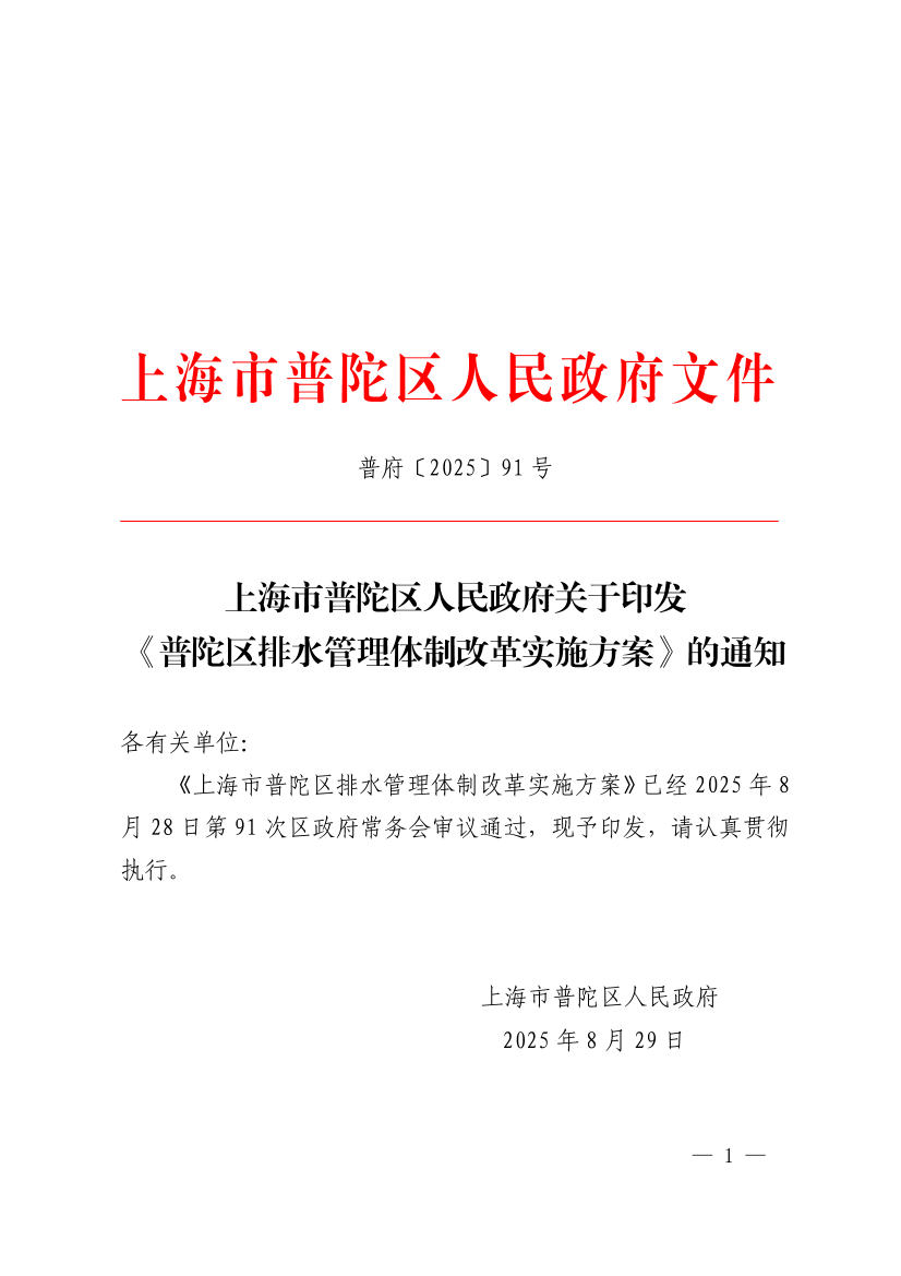 《上海市普陀区排水管理体制改革实施方案》已经2025年8月28日第91次区政府常务会审议通过,现予印发,请认真贯彻执行。