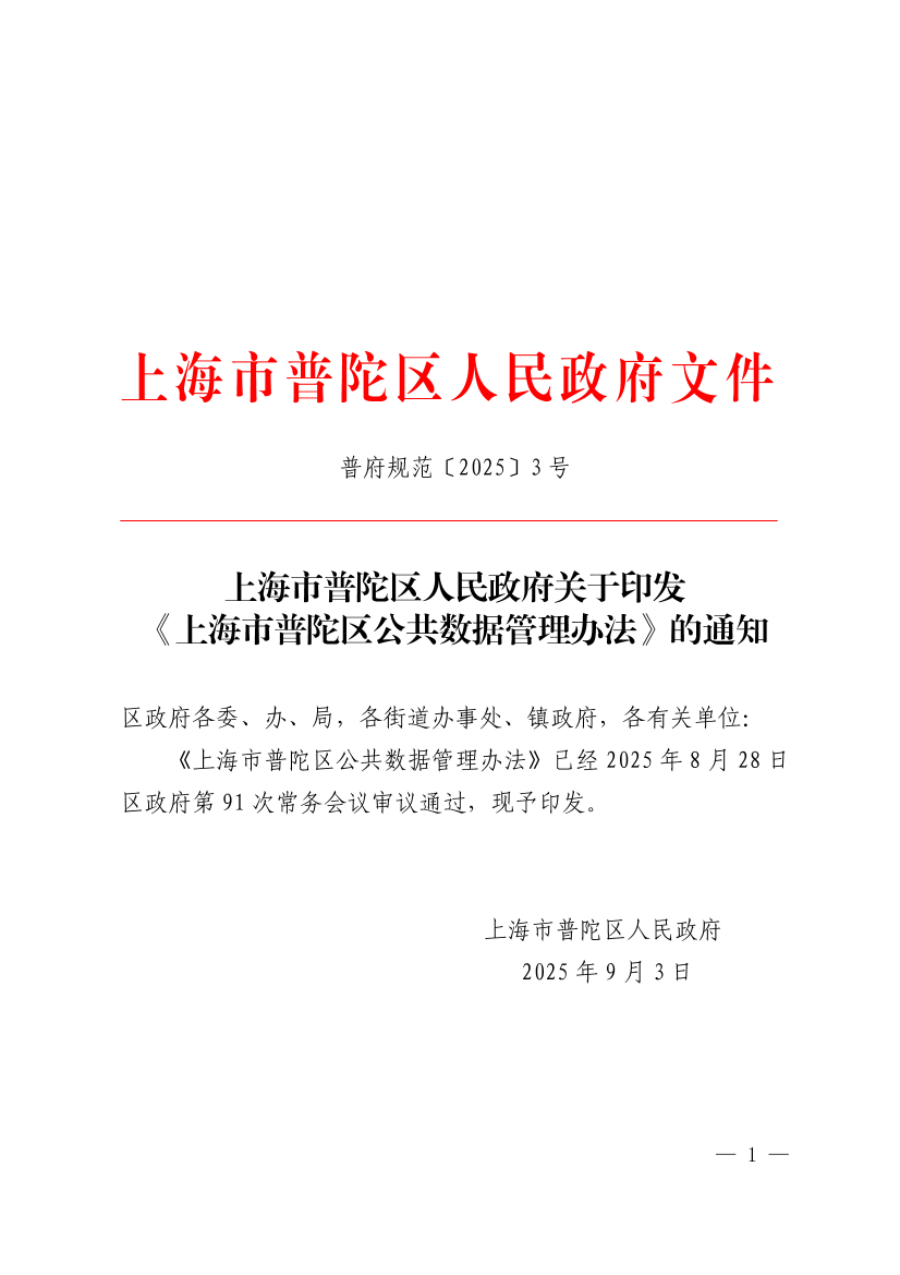 《上海市普陀区公共数据管理办法》已经2025年8月28日区政府第91次常务会议审议通过,现予印发。