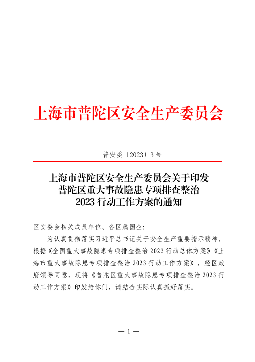 上海市普陀区安全生产委员会关于印发普陀区重大事故隐患专项排查整治2023行动工作方案的通知