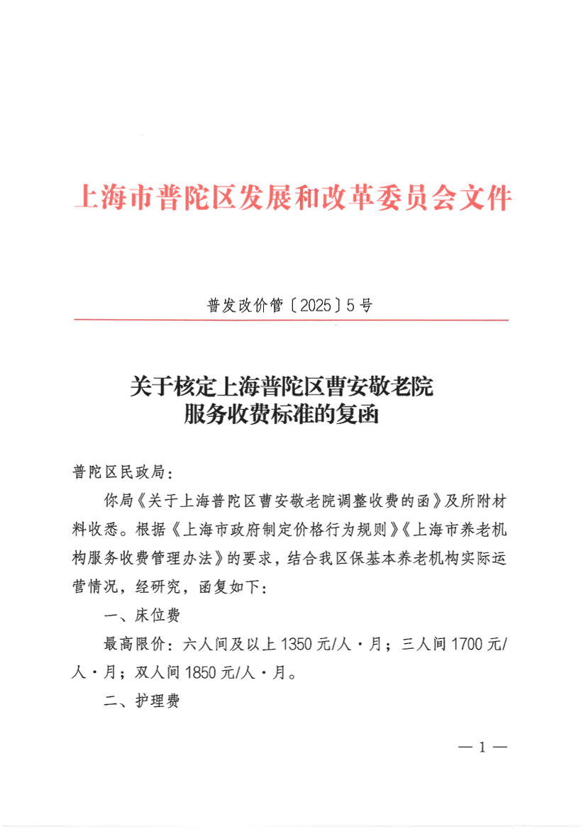 你局《关于上海普陀区曹安敬老院调整收费的函》及所附材料收悉。根据《上海市政府制定价格行为规则》《上海市养老机构服务收费管理办法》的要求,结合我区保基本养老机构实际运营情况,经研究,函复如下: