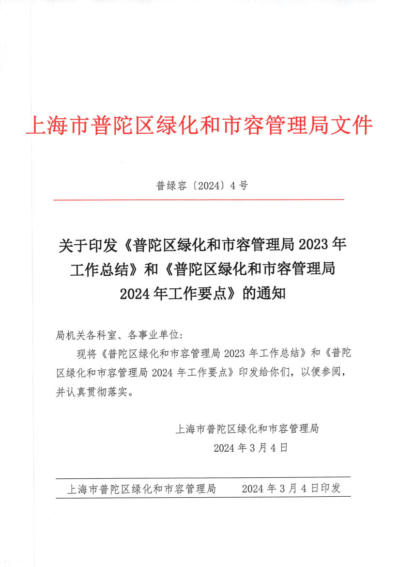 关于印发《普陀区绿化和市容管理局2023年工作总结》和《普陀区绿化和市容管理局2024年工作要点》的通知