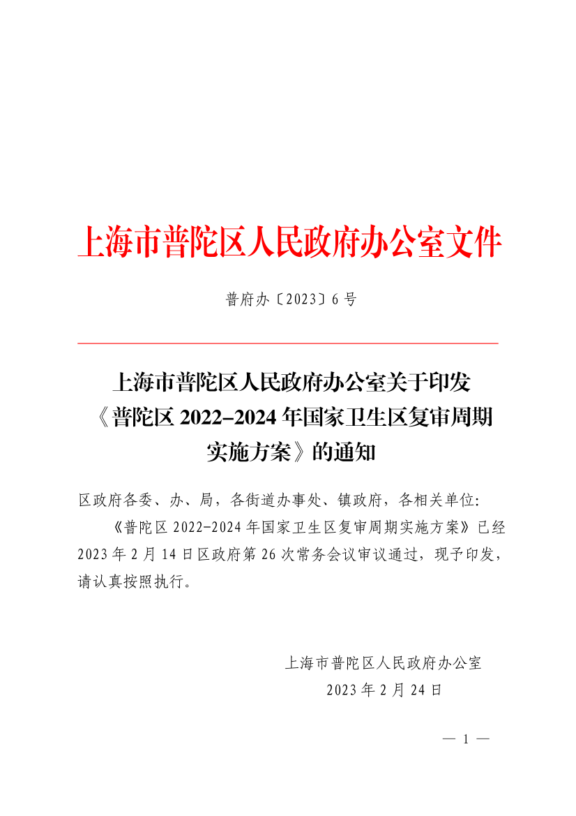 上海市普陀区人民政府办公室关于印发《普陀区2022-2024年国家卫生区复审周期实施方案》的通知