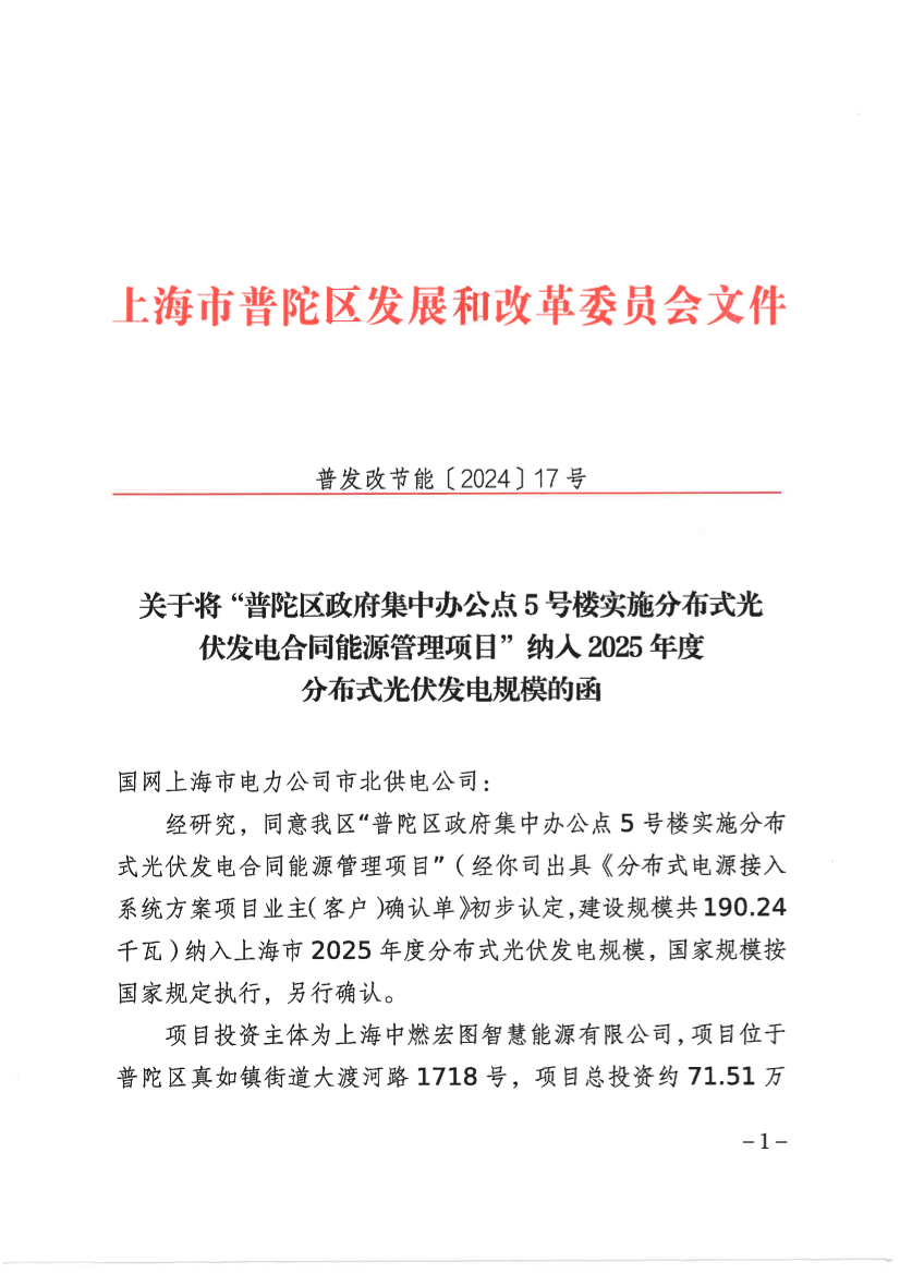 经研究,同意我区“普陀区政府集中办公点5号楼实施分布式光伏发电合同能源管理项目”(经你司出具《分布式电源接入系统方案项目业主(客户)确认单》初步认定,建设规模共190.24千瓦)纳入上海市2025年度分布式光伏发电规模,国家规模按国家规定执行,另行确认。