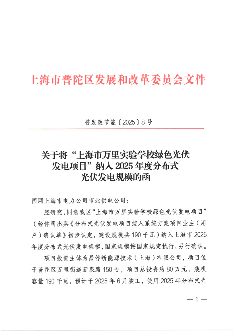 经研究,同意我区“上海市万里实验学校绿色光伏发电项目”(经你司出具《分布式光伏发电项目接入系统方案项目业主(用户)确认单》初步认定,建设规模共190千瓦)纳入上海市2025年度分布式光伏发电规模,国家规模按国家规定执行,另行确认。