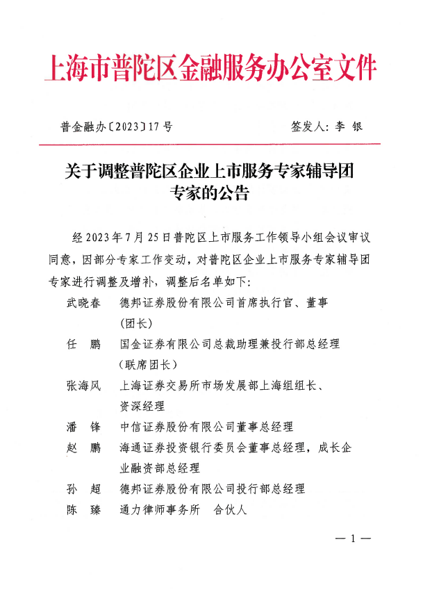 经2023年7月25日普陀区上市服务工作领导小组会议审议同意,因部分专家工作变动,对普陀区企业上市服务专家辅导团专家进行调整及增补,调整后名单如下: