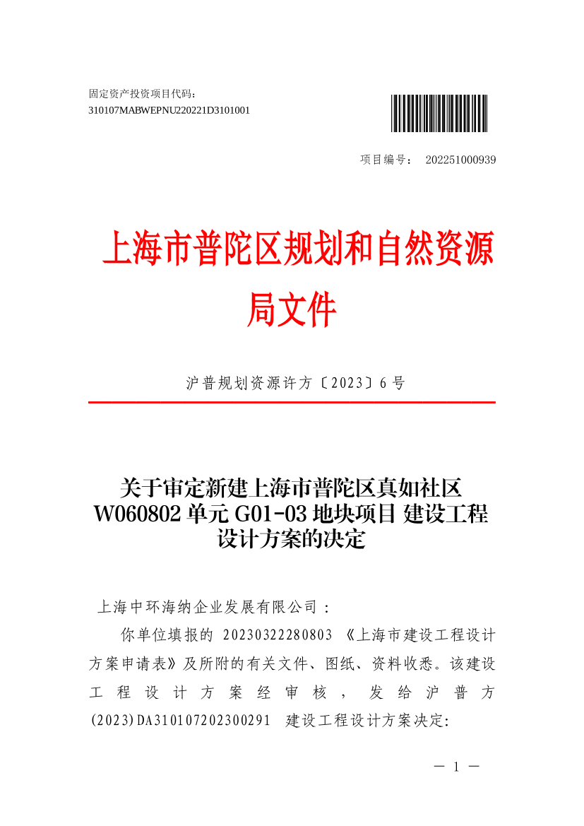 关于审定新建上海市普陀区真如社区W060802单元G01-03地块项目建设工程设计方案的决定