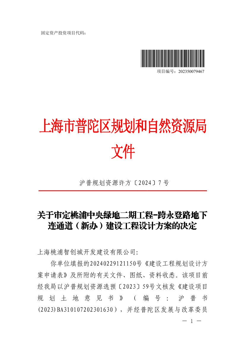 关于审定桃浦中央绿地二期工程-跨永登路地下连通道(新办)建设工程设计方案的决定