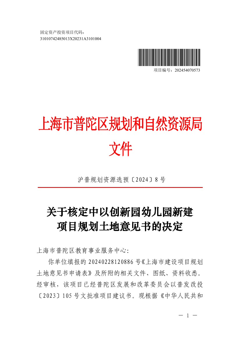 你单位填报的20240228120886号《上海市建设项目规划土地意见书申请表》及所附的相关文件、图纸、资料收悉。 经审核,该项目已经普陀区发展和改革委员会以普发改投〔2023〕105号文批准项目建议书。现根据《中华人民共和国土地管理法》、《中华人民共和国城乡规划法》、《自然资源部关于以“多规合一”为基础推进规划用地“多审合 一、多证合一”改革的通知》(自然资规〔2019〕2号)以及本市国土空间规划管理的有关规定,同意核发中以创新园幼儿园新建项目《建设项目选址意见书》(编号:沪普书 (2024)BA310107202400288),并提出选址(用地预审)意见如下: