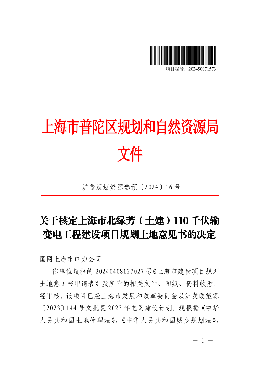 你单位填报的20240408127027号《上海市建设项目规划土地意见书申请表》及所附的相关文件、图纸、资料收悉。经审核,该项目已经上海市发展和改革委员会以沪发改能源〔2023〕144号文批复2023年电网建设计划。现根据《中华人民共和国土地管理法》、《中华人民共和国城乡规划法》、《自然资源部关于以“多规合一”为基础推进规划用地“多审合一、多证合一”改革的通知》(自然资规〔2019〕2号)以及本市国土空间规划管理的有关规定,同意核发上海市北绿芳(土建)110千伏输变电工程《建设项目选址意见书》(编号:沪普书(2024)BA310107202400506),并提出选址(用地预审)意见如下: