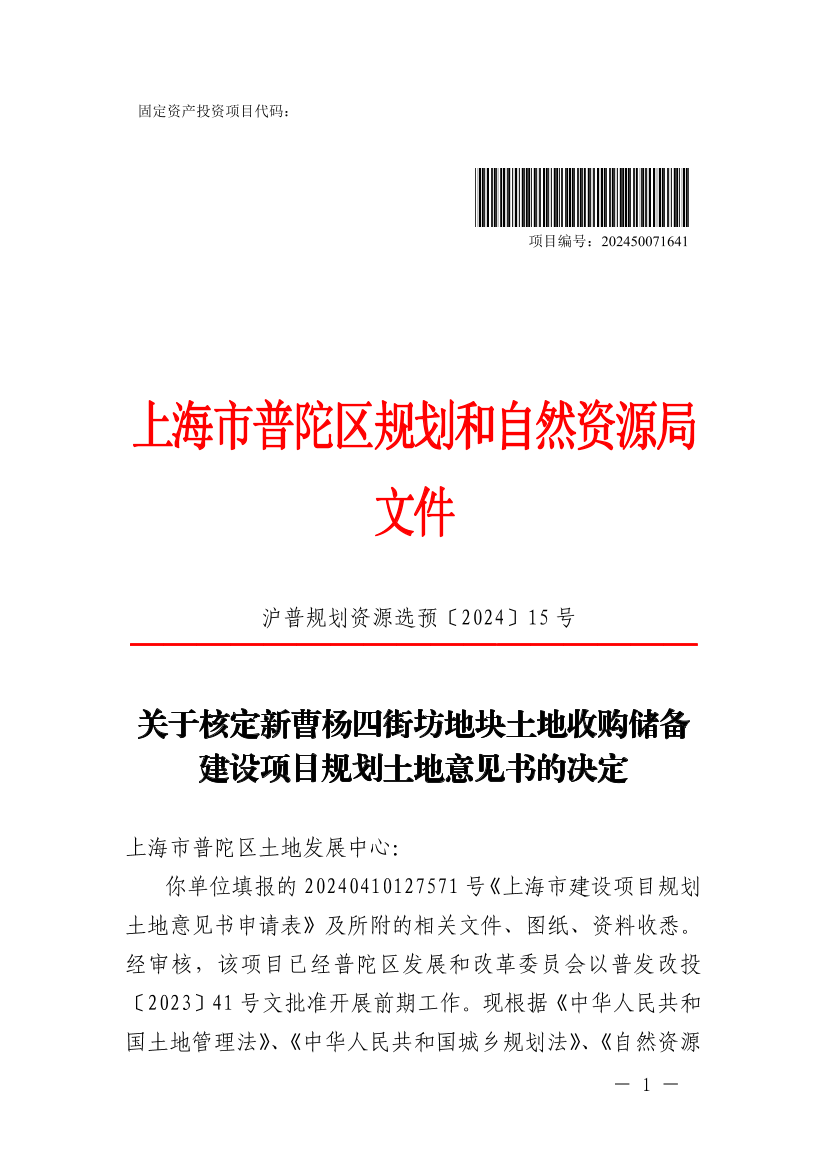 你单位填报的20240410127571号《上海市建设项目规划土地意见书申请表》及所附的相关文件、图纸、资料收悉。 经审核,该项目已经普陀区发展和改革委员会以普发改投〔2023〕41号文批准开展前期工作。现根据《中华人民共和国土地管理法》、《中华人民共和国城乡规划法》、《自然资源部关于以“多规合一”为基础推进规划用地“多审合一、 多证合一”改革的通知》(自然资规〔2019〕2号)以及本市国土空间规划管理的有关规定,同意核发新曹杨四街坊地块土地收购储备《建设项目选址意见书》(编号:沪普书(2024)BA310107202400505)。