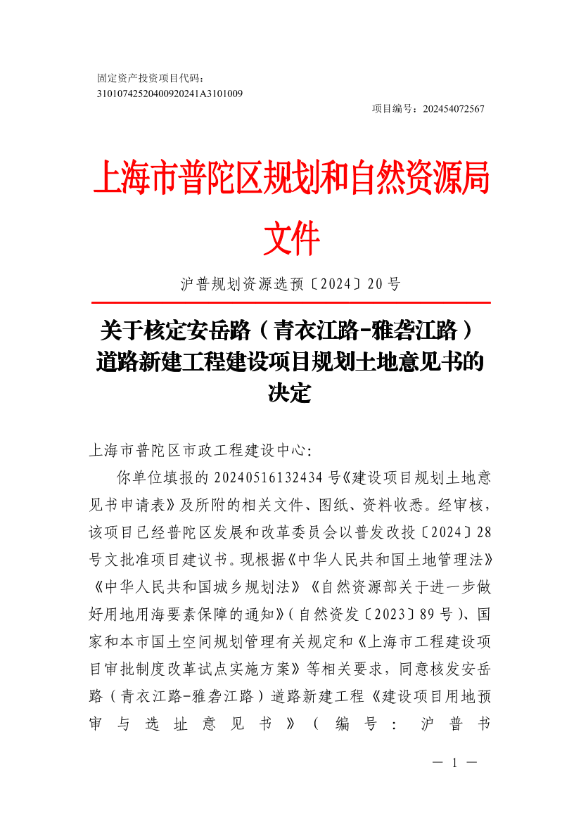 你单位填报的20240516132434号《建设项目规划土地意见书申请表》及所附的相关文件、图纸、资料收悉。经审核,该项目已经普陀区发展和改革委员会以普发改投〔2024〕28号文批准项目建议书。现根据《中华人民共和国土地管理法》《中华人民共和国城乡规划法》《自然资源部关于进一步做好用地用海要素保障的通知》(自然资发〔2023〕89号)、国家和本市国土空间规划管理有关规定和《上海市工程建设项目审批制度改革试点实施方案》等相关要求,同意核发安岳路(青衣江路-雅砻江路)道路新建工程《建设项目用地预审与选址意见书》(编号:沪普书(2024)BA310107202400695),并告知相关管理意见如下: