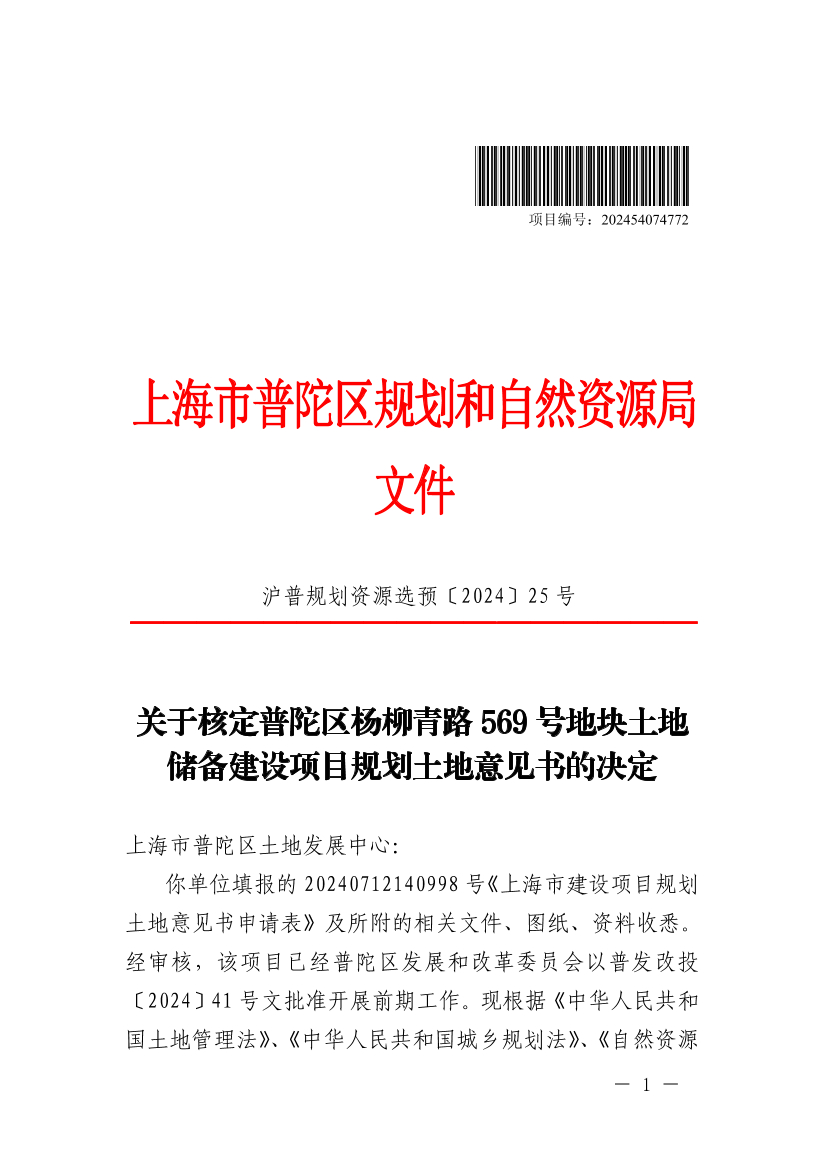 关于核定普陀区杨柳青路569号地块土地储备建设项目规划土地意见书的决定