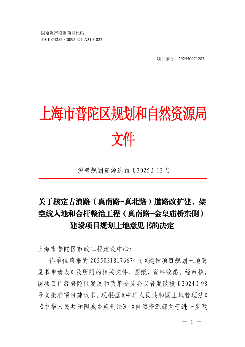 你单位填报的20250318176674号《建设项目规划土地意见书申请表》及所附的相关文件、图纸、资料收悉。经审核,该项目已经普陀区发展和改革委员会以普发改投〔2024〕98号文批准项目建议书。现根据《中华人民共和国土地管理法》《中华人民共和国城乡规划法》《自然资源部关于进一步做好用地用海要素保障的通知》(自然资发〔2023〕89号)、国家和本市国土空间规划管理有关规定和《上海市工程建设项目审批制度改革试点实施方案》等相关要求,同意核发古浪路(真南路-真北路)道路改扩建、架空线入地和合杆整治工程(真南路-金皇庙桥东侧)项目《建设项目用地预审与选址意见书》(编号:沪普书(2025)BA310107202500248), 并告知相关管理意见如下: