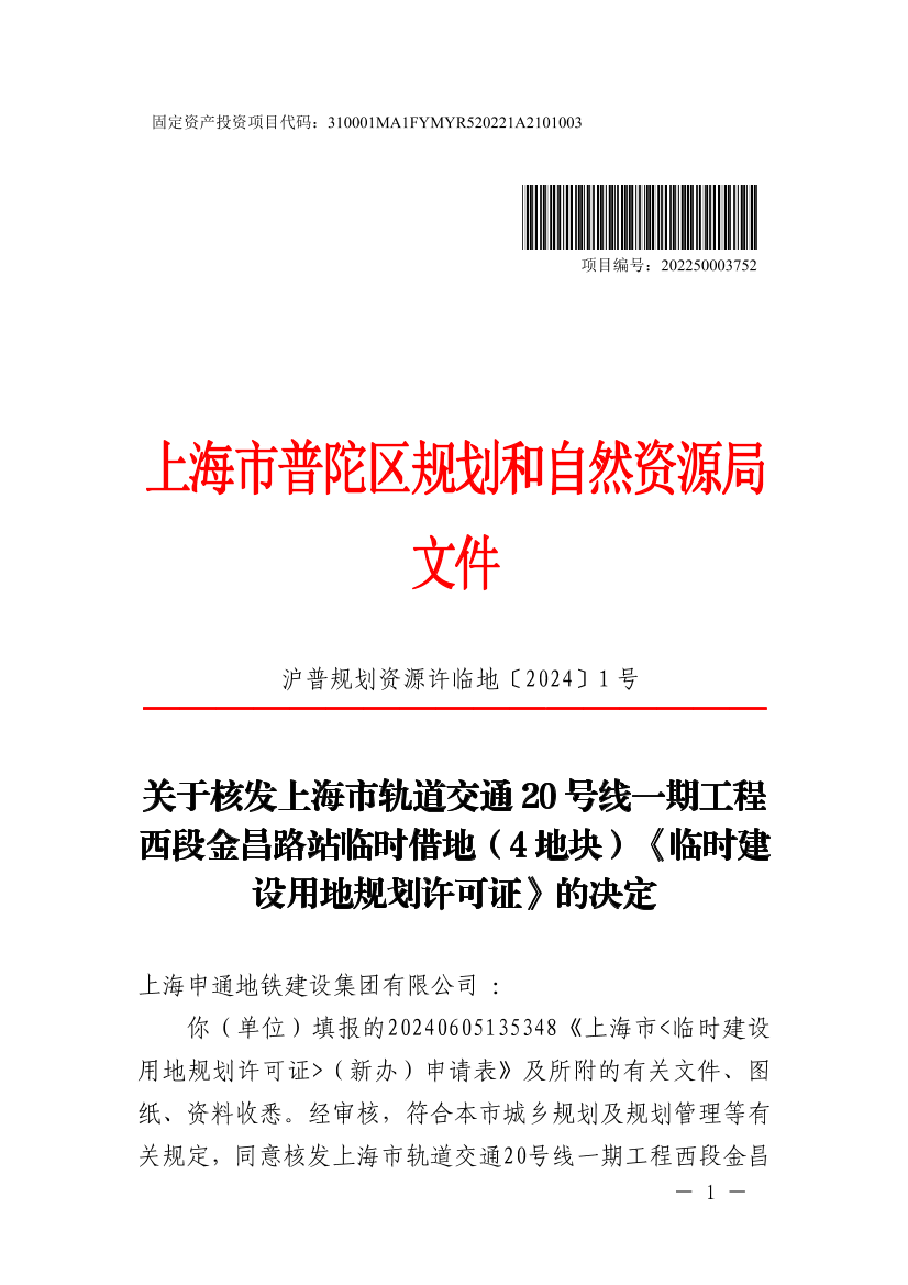 关于核发上海市轨道交通20号线一期工程西段金昌路站临时借地(4地块)《临时建设用地规划许可证》的决定
