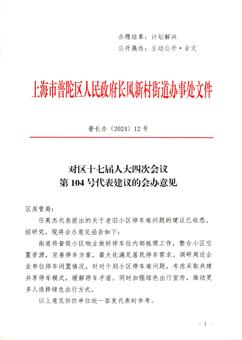 任英杰代表提出的关于老旧小区停车难问题的建议已收悉,经研究,现将会办意见函告如下: