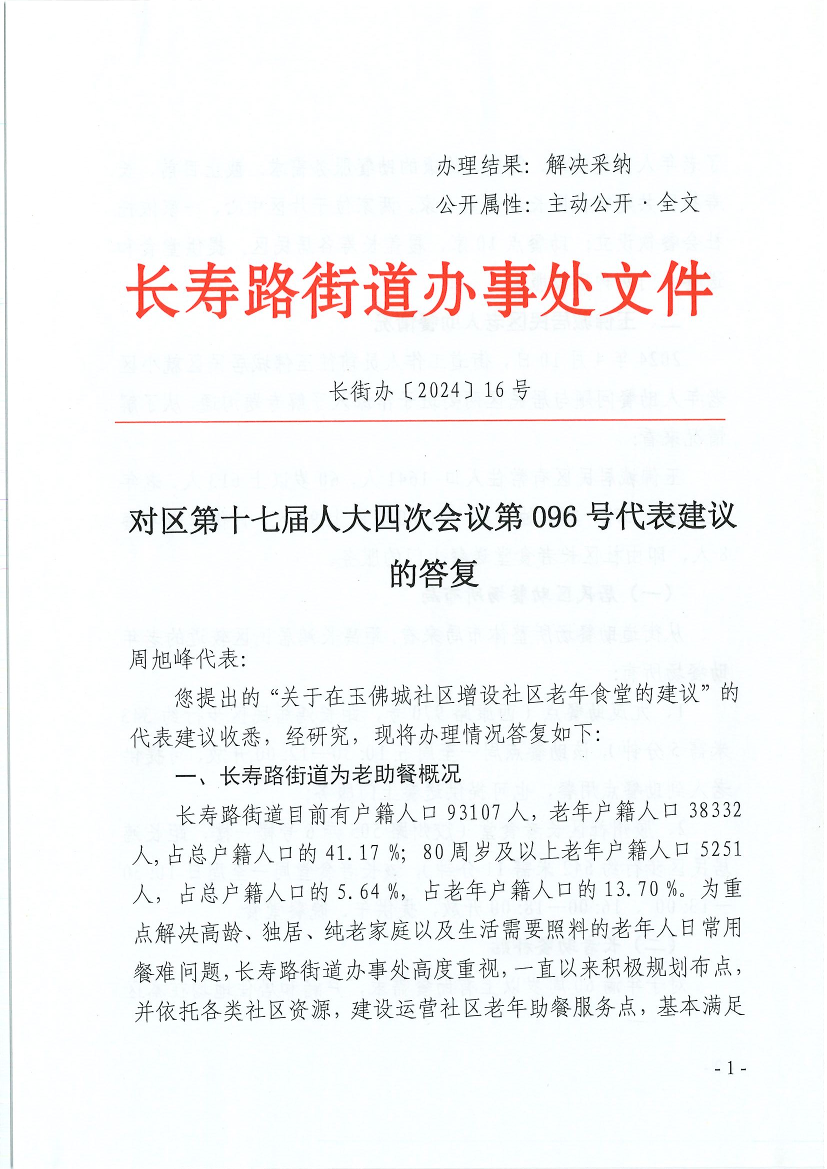您提出的“关于在玉佛城社区增设社区老年食堂的建议”的代表建议收悉,经研究,现将办理情况答复如下:
