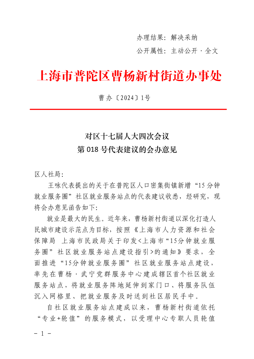 王咏代表提出的关于在普陀区人口密集街镇新增“15分钟就业服务圈”社区就业服务站点的代表建议收悉,经研究,现将会办意见函告如下: