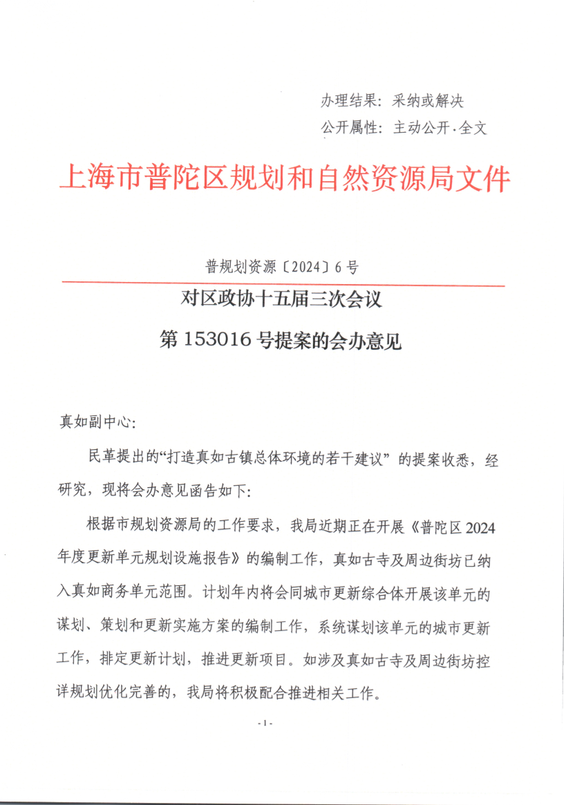 民革提出的“打造真如古镇总体环境的若干建议”的提案收悉,经研究,现将会办意见函告如下:
