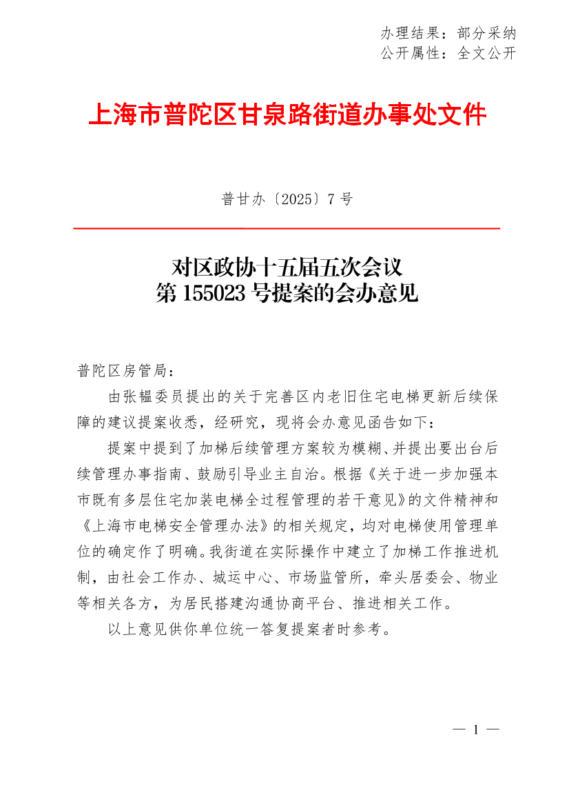 由张韫委员提出的关于完善区内老旧住宅电梯更新后续保障的建议提案收悉,经研究,现将会办意见函告如下: