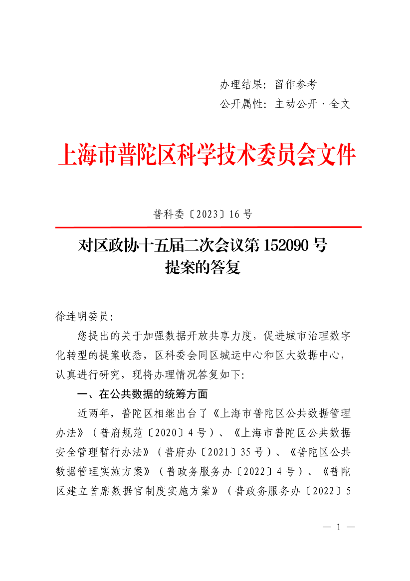 您提出的关于加强数据开放共享力度,促进城市治理数字化转型的提案收悉,区科委会同区城运中心和区大数据中心,认真进行研究,现将办理情况答复如下: