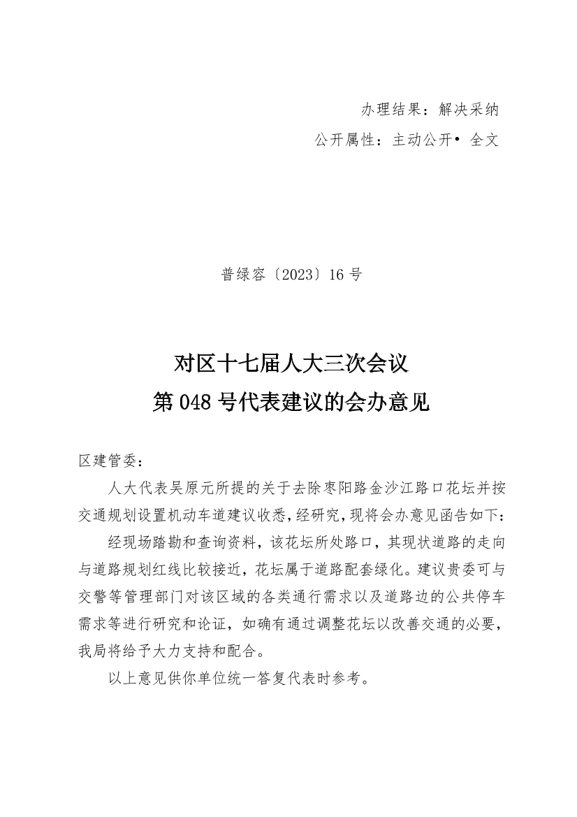 人大代表吴原元所提的关于去除枣阳路金沙江路口花坛并按交通规划设置机动车道建议收悉,经研究,现将会办意见函告如下: