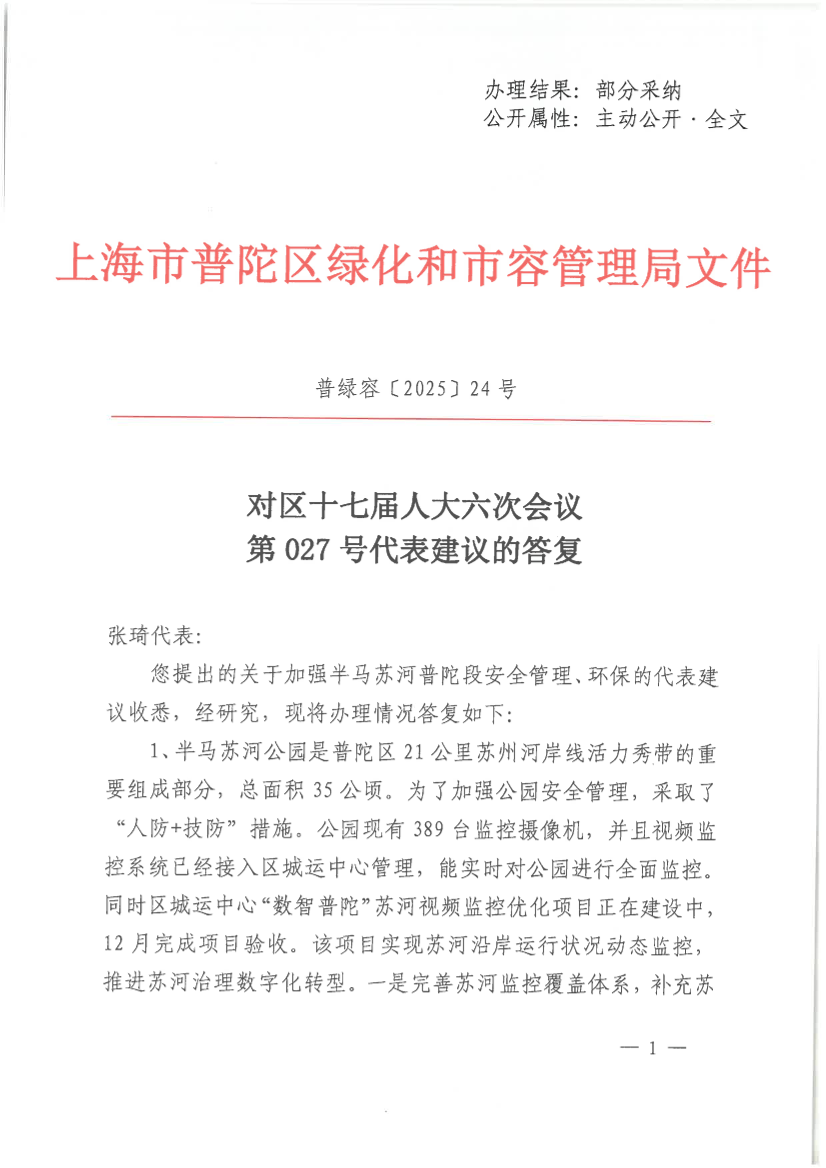您提出的关于加强半马苏河普陀段安全管理、环保的代表建议收悉,经研究,现将办理情况答复如下: