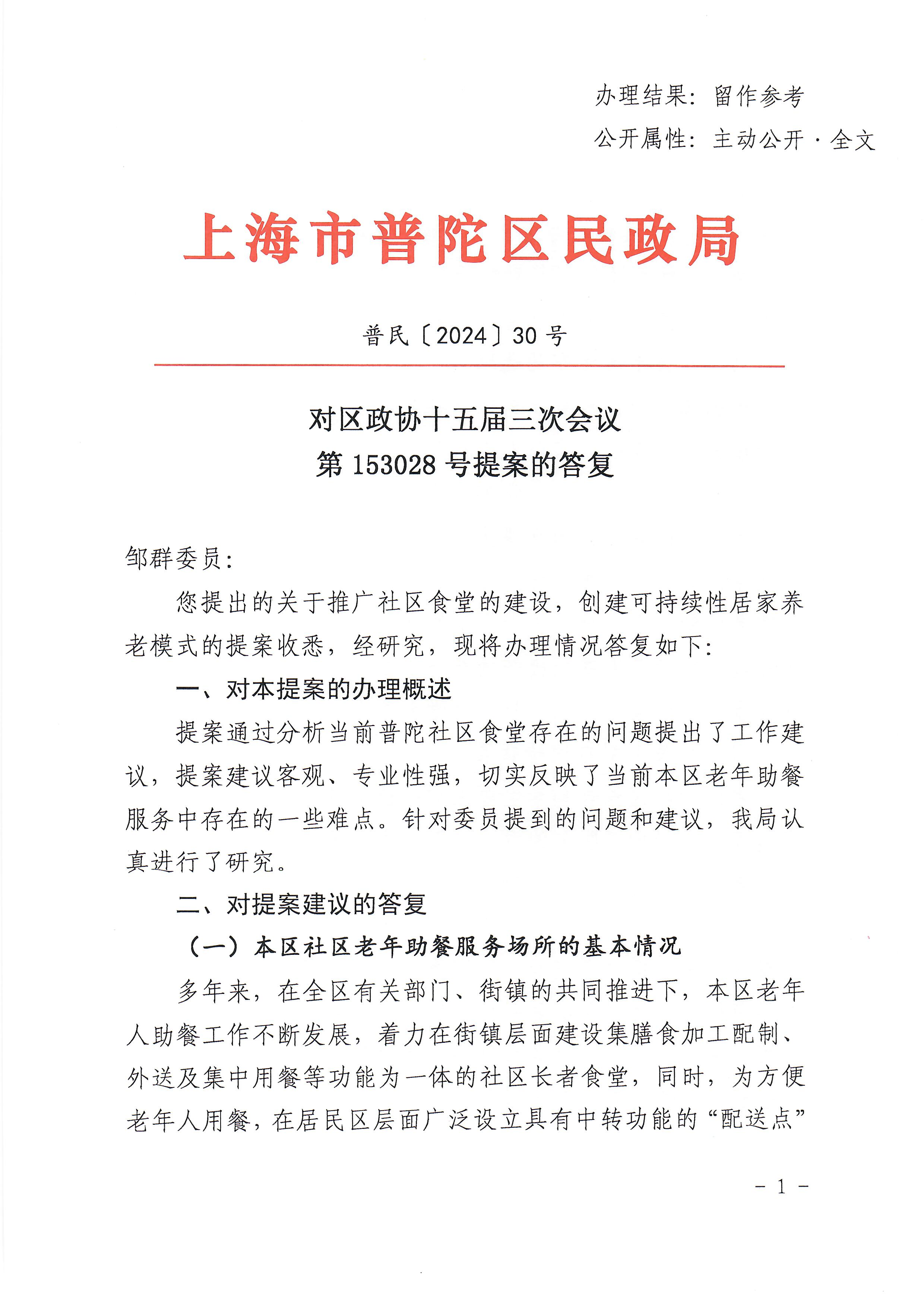 您提出的关于推广社区食堂的建设,创建可持续性居家养老模式的提案收悉,经研究,现将办理情况答复如下: