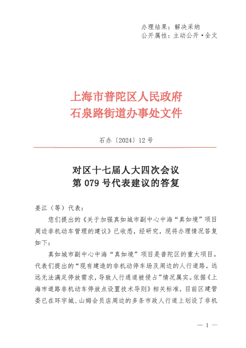 您们提出的《关于加强真如城市副中心中海“真如境”项目周边非机动车管理的建议》已收悉,经研究,现将办理情况答复如下: