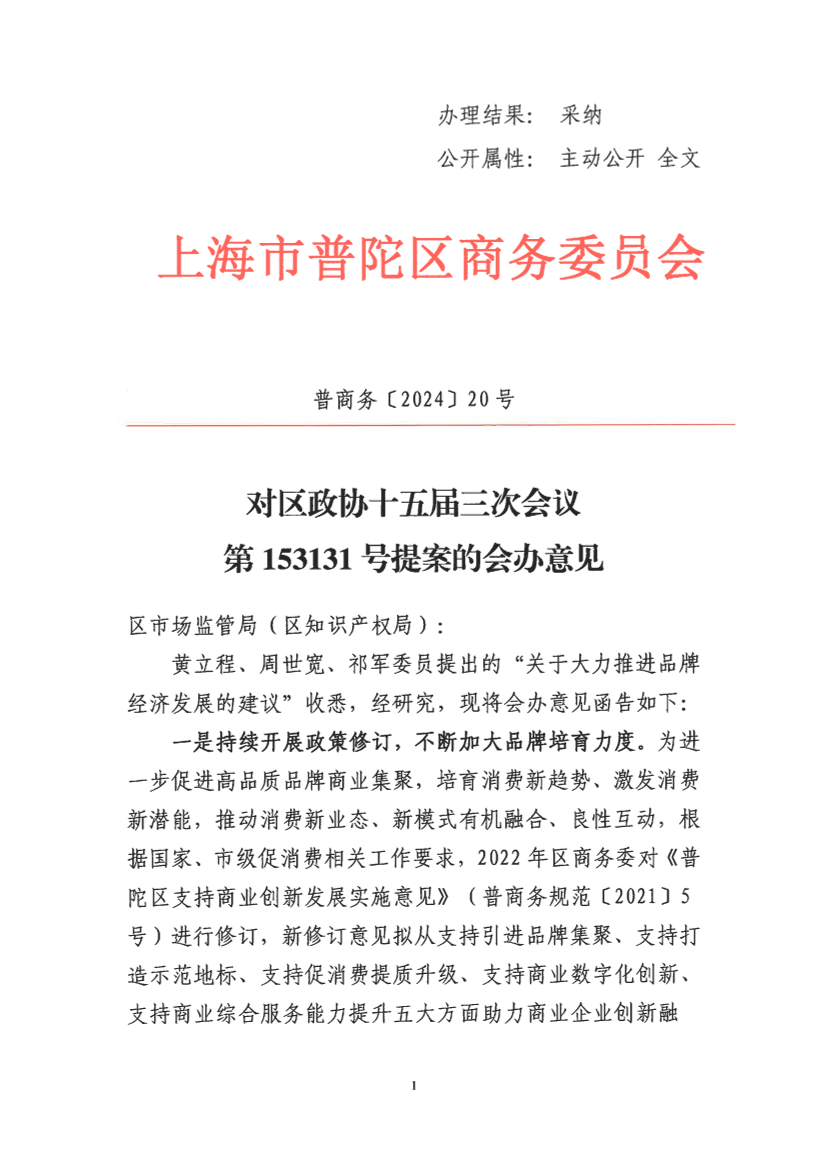 黄立程、周世宽、祁军委员提出的“关于大力推进品牌经济发展的建议”收悉,经研究,现将会办意见函告如下: