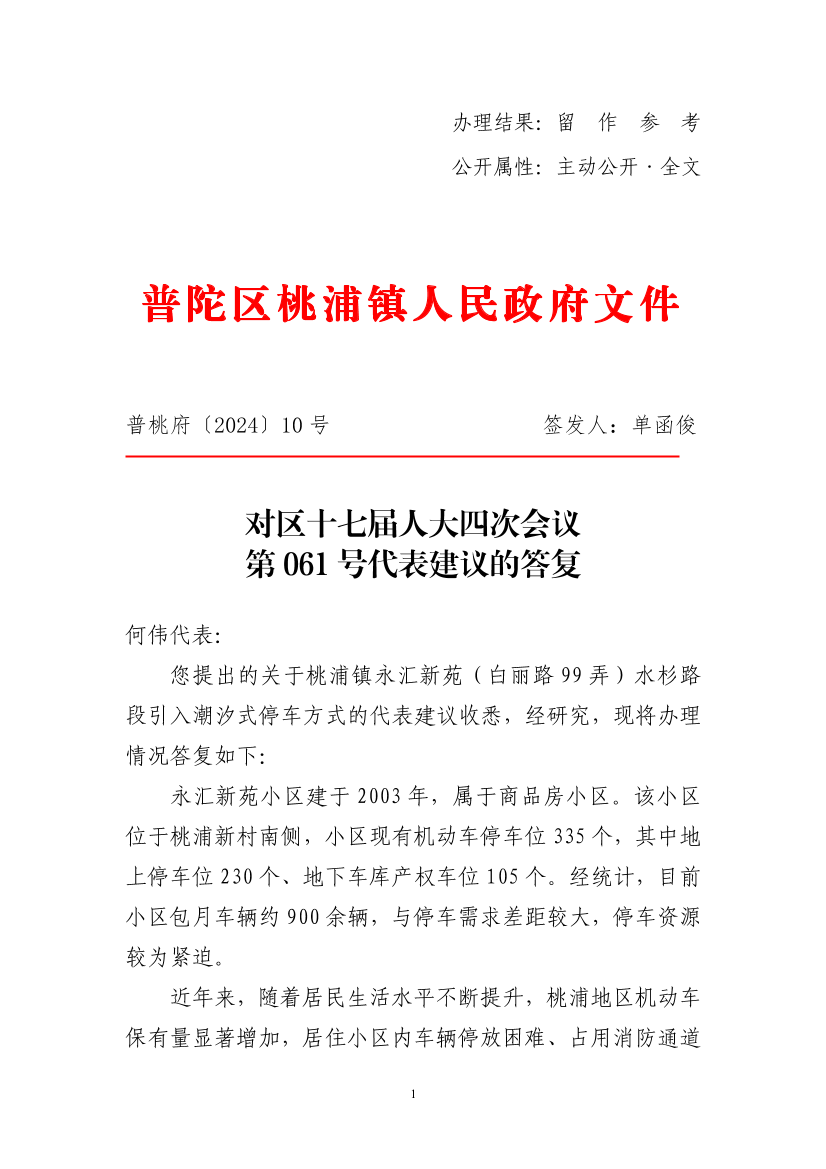 您提出的关于桃浦镇永汇新苑(白丽路99弄)水杉路段引入潮汐式停车方式的代表建议收悉,经研究,现将办理情况答复如下: