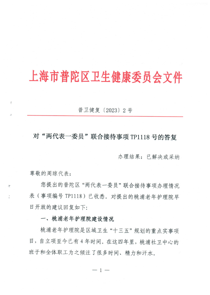 您提出的普陀区“两代表一委员”联合接待事项办理情况表(事项编号TP1118)已收悉。对提出的桃浦老年护理院早日开放的建议回复如下:
