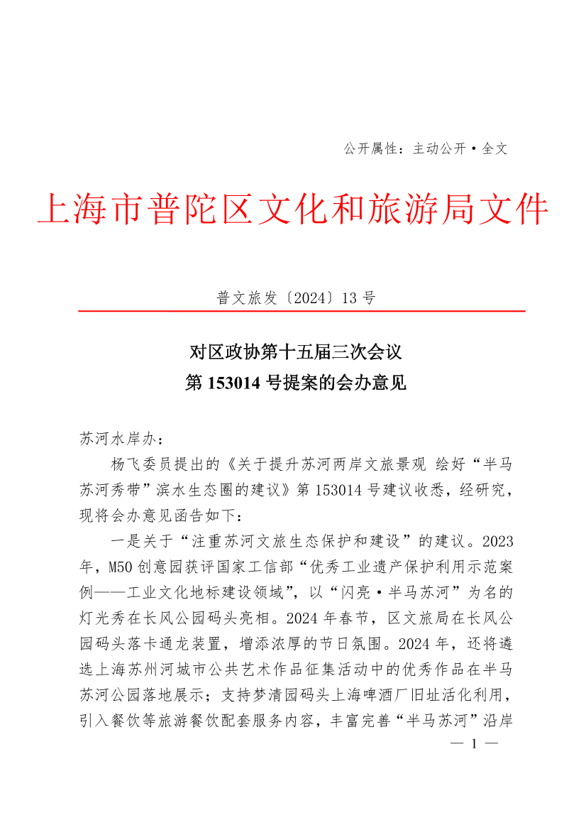 杨飞委员提出的《关于提升苏河两岸文旅景观 绘好“半马苏河秀带”滨水生态圈的建议》第153014号建议收悉,经研究,现将会办意见函告如下: