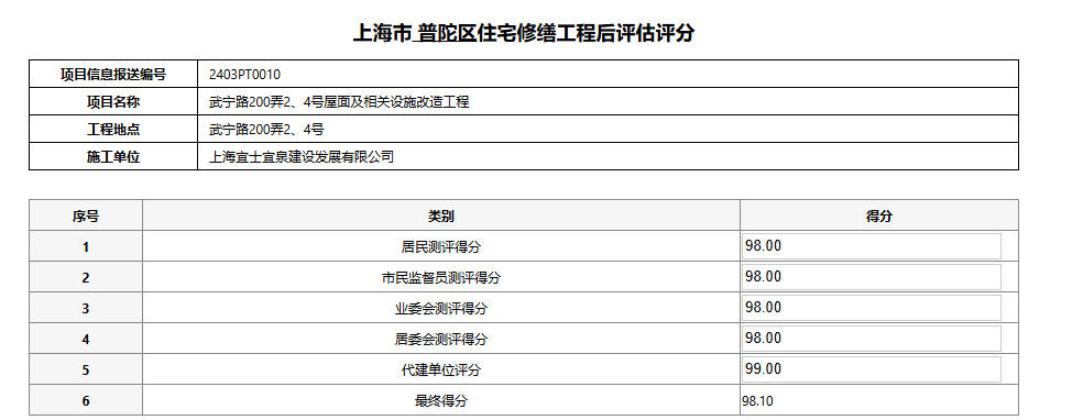 关于武宁路200弄2、4号屋面及相关设施改造工程后评估考核公示