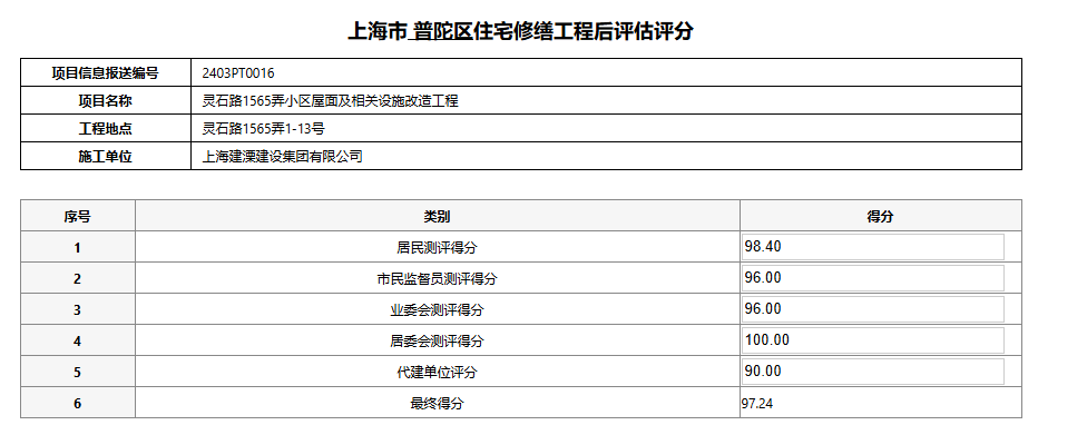 关于灵石路1565弄小区屋面及相关设施改造工程后评估考核公示