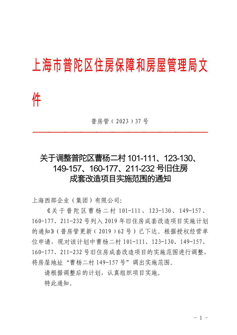 关于调整普陀区曹杨二村101-111、123-130、149-157、160-177、211-232号旧住房成套改造项目实施范围的通知