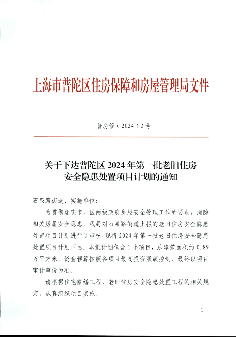 关于下达普陀区2024年第一批老旧住房安全隐患处置项目计划的通知