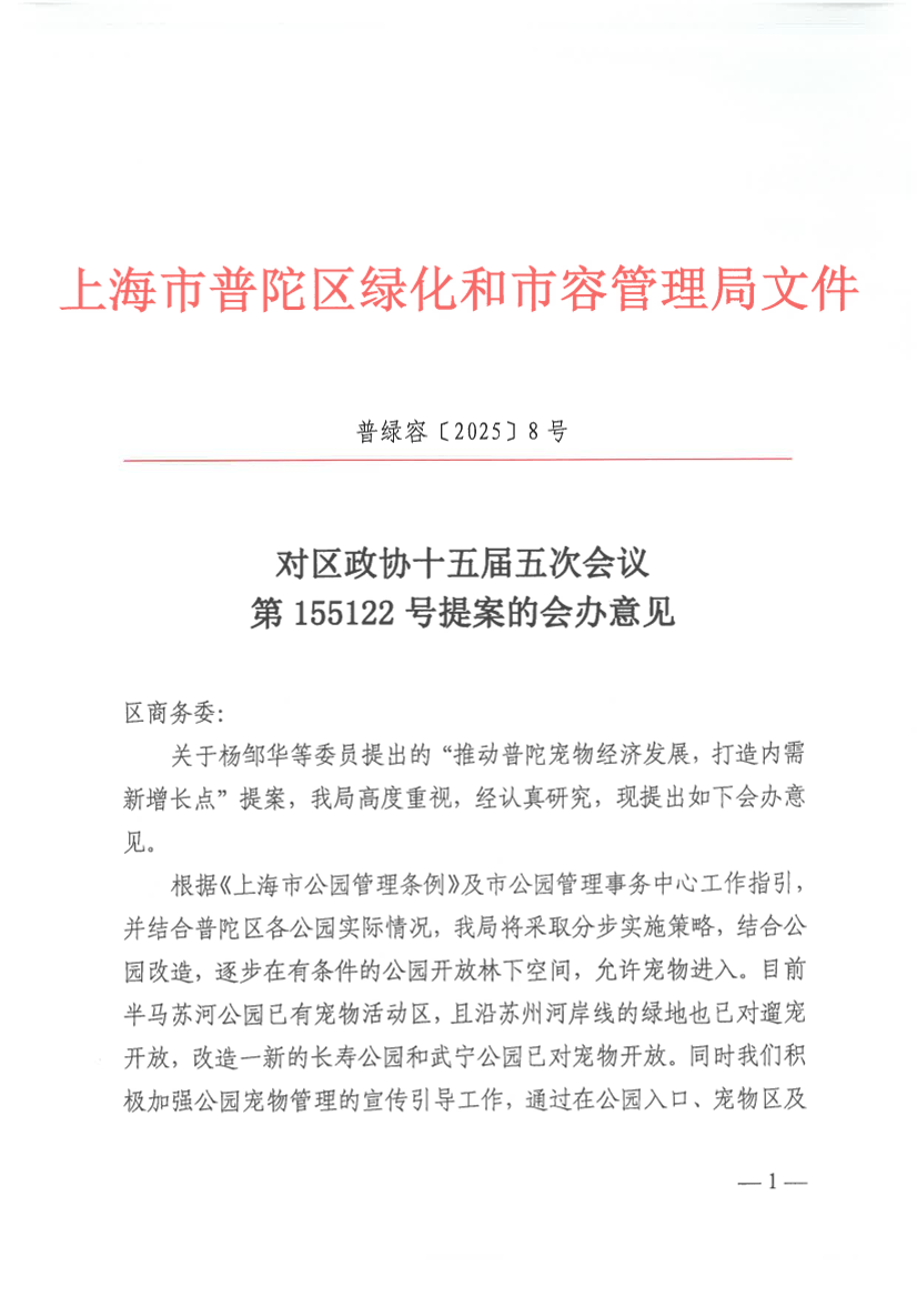 根据《上海市公园管理条例》及市公园管理事务中心工作指引,并结合普陀区各公园实际情况,我局将采取分步实施策略,结合公园改造,逐步在有条件的公园开放林下空间,允许宠物进入。目前半马苏河公园已有宠物活动区,且沿苏州河岸线的绿地也已对遛宠开放,改造一新的长寿公园和武宁公园已对宠物开放。同时我们积极加强公园宠物管理的宣传引导工作,通过在公园入口、宠物区及其他显著位置设置宣传标识牌,向市民宣传文明养宠知识和公园宠物管理规定。