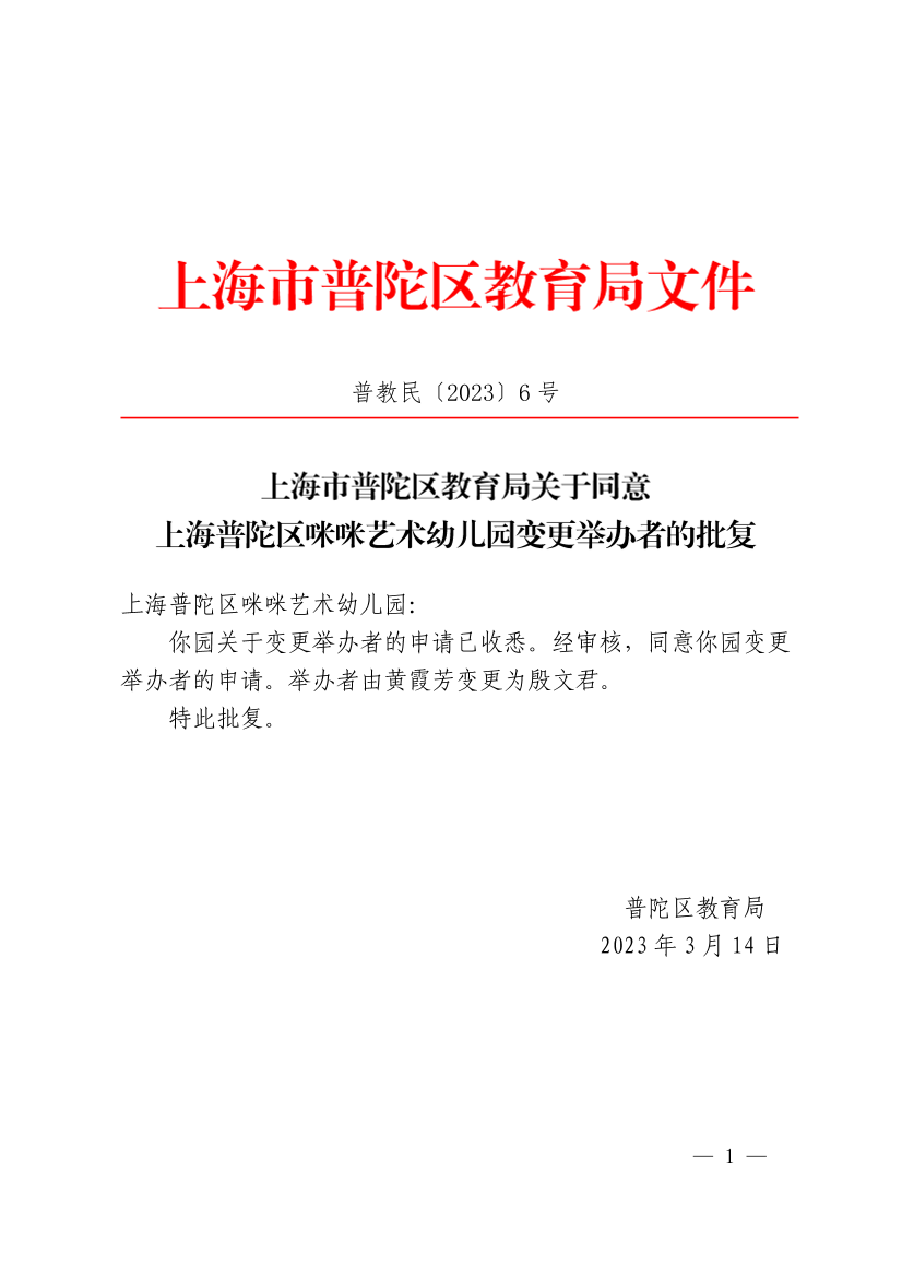 普教民〔2023〕6号 上海市普陀区教育局关于同意咪咪幼儿园变更举办者的批复.pdf