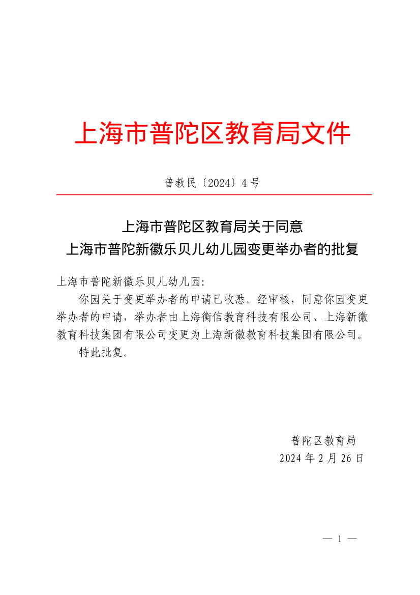 你园关于变更举办者的申请已收悉。经审核,同意你园变更举办者的申请,举办者由上海衡信教育科技有限公司、上海新徽教育科技集团有限公司变更为上海新徽教育科技集团有限公司。