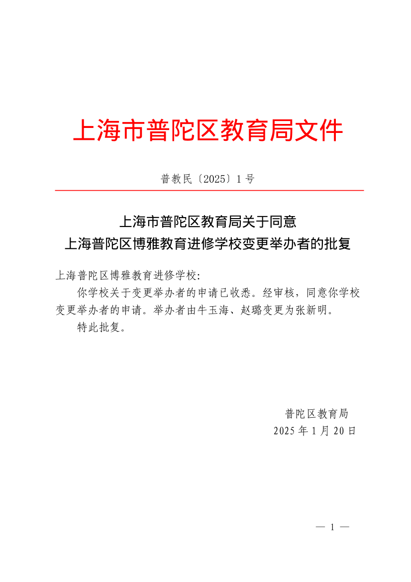关于同意上海普陀区博雅教育进修学校变更举办者的批复