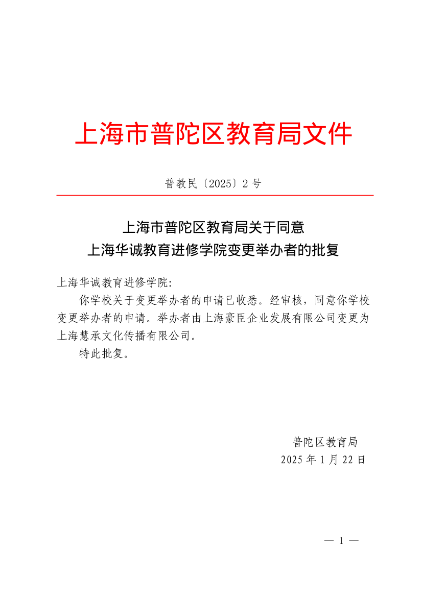 你学校关于变更举办者的申请已收悉。经审核,同意你学校变更举办者的申请。举办者由上海豪臣企业发展有限公司变更为上海慧承文化传播有限公司。