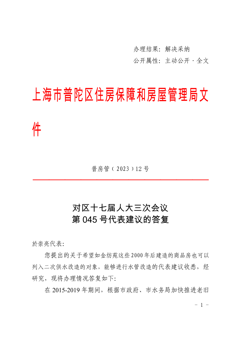 在2015-2019年期间,根据市政府、市水务局加快推进老旧住宅小区二次供水改造工作的相关精神,由市城投水务公司对普陀区老旧住宅小区及2000年之前建造的商品房住宅小区开展了二次供水设施改造,改造内容包括楼宇管道的更换、水表外移、水箱和地下水池改造以及泵房设备更换等。根据先行市级层面政策精神,如金纺苑小区(曹杨路2168弄)这些2000年后建成的早期商品房小区无法纳入享受财政补贴的二次供水改造范围。我局已向相关部门建议,请上海市水务局、市城投水务公司牵头调研相关2000年后早期商品房小区的实际情况,进一步推动全市二次供水改造工作,我局做好积极配合工作。