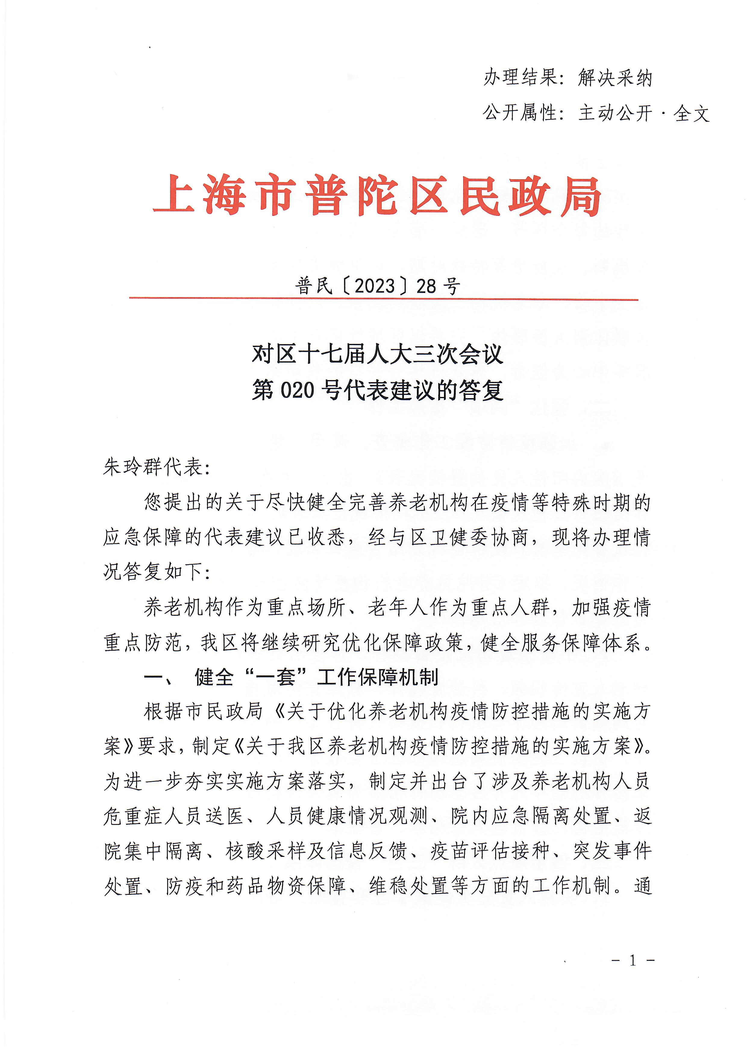 您提出的关于尽快健全完善养老机构在疫情等特殊时期的应急保障的代表建议已收悉,经与区卫健委协商,现将办理情况答复如下: