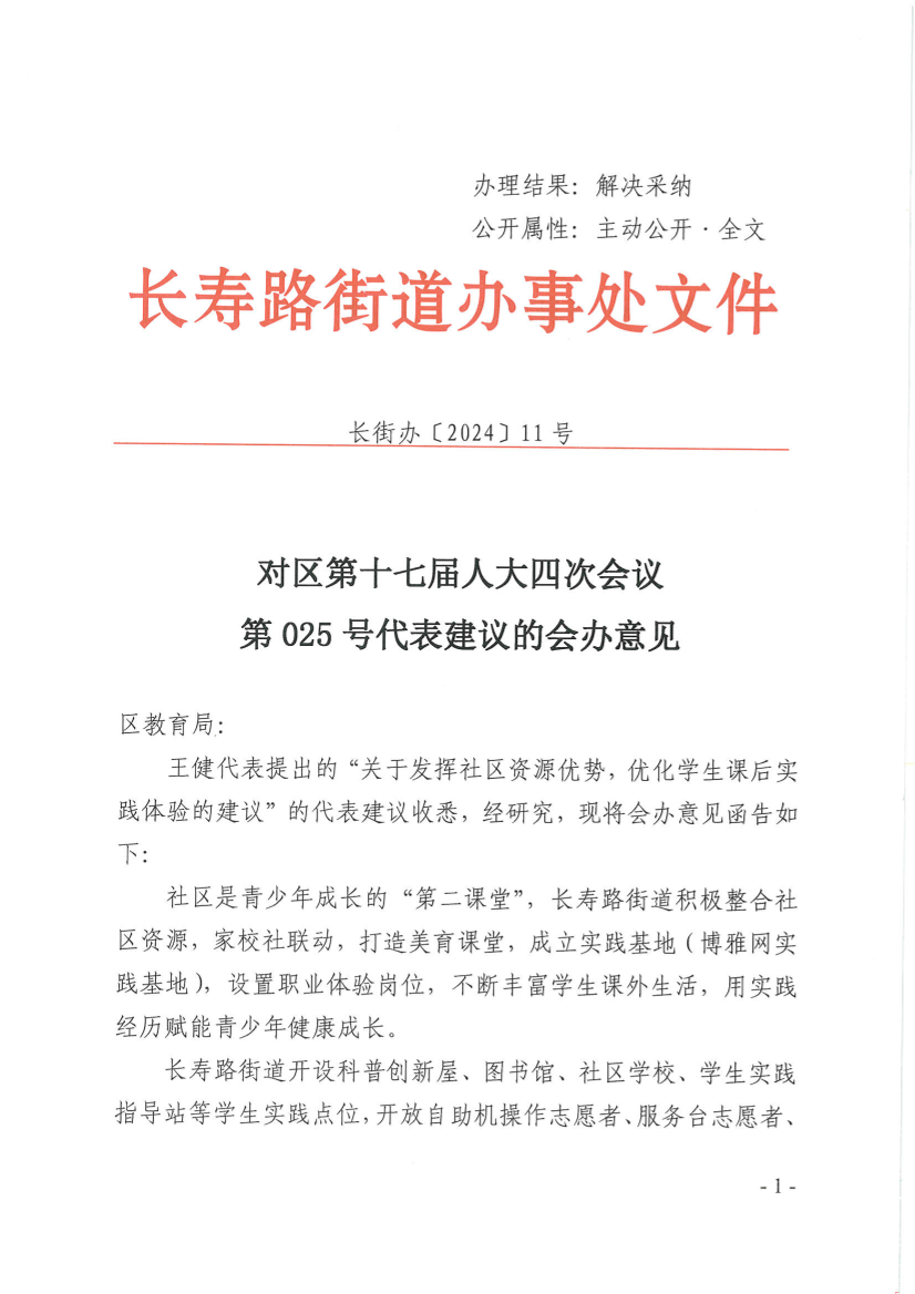 王健代表提出的“关于发挥社区资源优势,优化学生课后实践体验的建议”的代表建议收悉,经研究,现将会办意见函告如下: