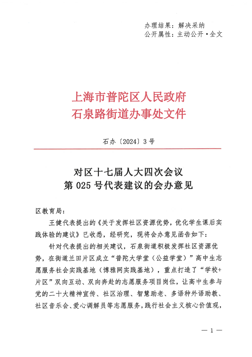 针对代表提出的相关建议,石泉街道积极发挥社区资源优势,在街道兰田片区成立“普陀大学堂(公益学堂)”高中生志愿服务社会实践基地(博雅网实践基地),重点打造了“学校+片区”双向互动、双向奔赴的志愿服务项目岗位,让高中生参与党的二十大精神宣传、社区治理、智慧助老、多语种外语助教、社区音乐会、爱心调解员等志愿服务,践行社会主义核心价值观,增强对国家和社会的责任感。