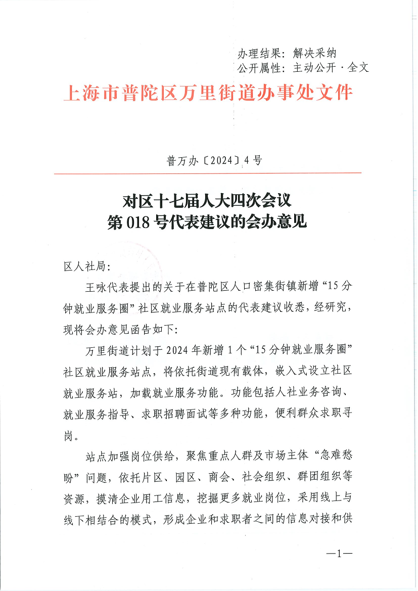 王咏代表提出的关于在普陀区人口密集街镇新增“15分钟就业服务圈”社区就业服务站点的代表建议收悉,经研究,现将会办意见函告如下: