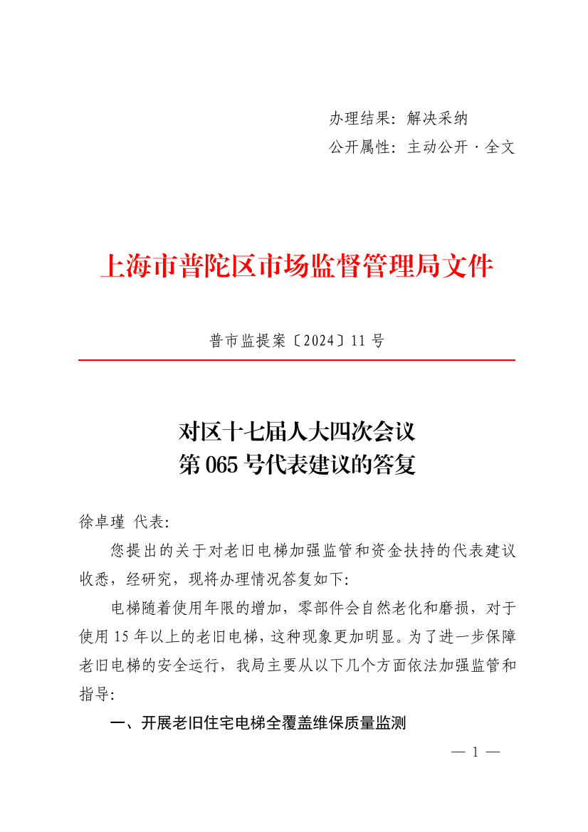 您提出的关于对老旧电梯加强监管和资金扶持的代表建议收悉,经研究,现将办理情况答复如下: