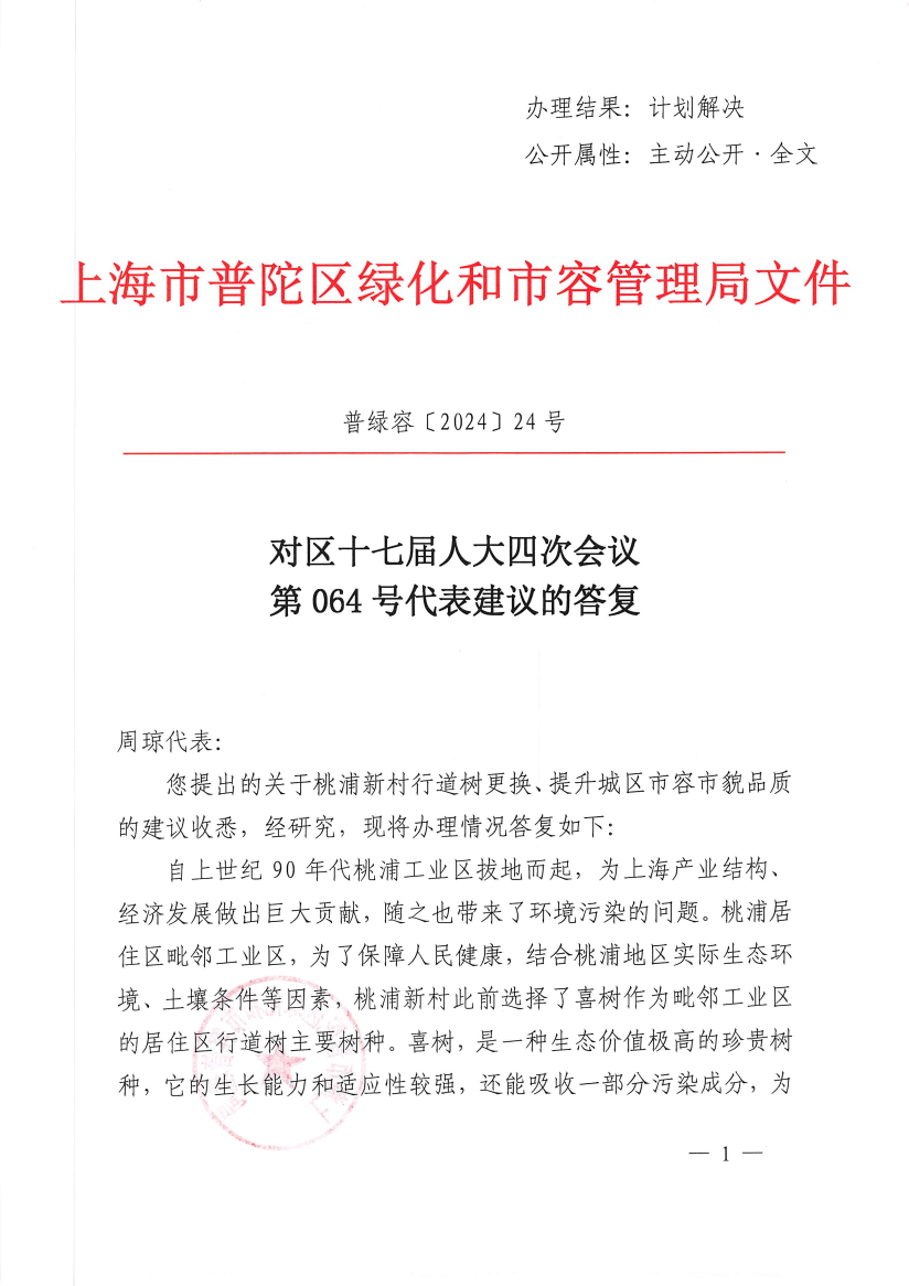 您提出的关于桃浦新村行道树更换、提升城区市容市貌品质的建议收悉,经研究,现将办理情况答复如下: